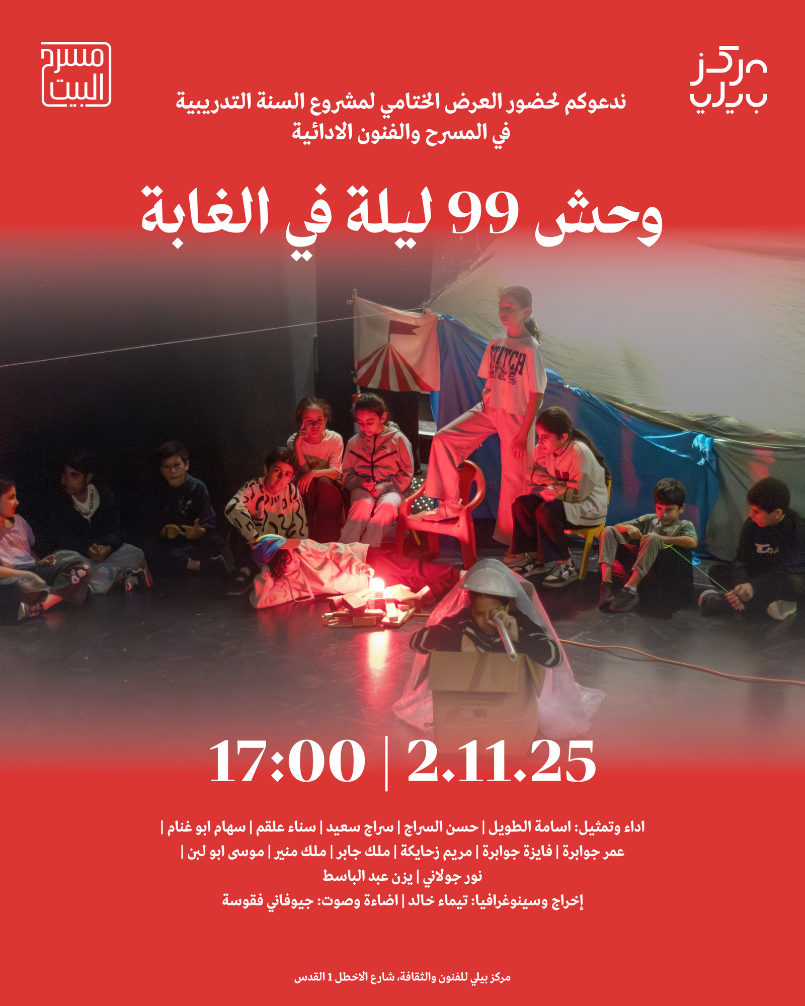 تُشرف على هذه التدريبات المدرّبة تيماء خالد المختصة في المسرح، التي تسعى إلى احتضان المواهب الشابة وتنميتها ومنحهم الفرصة لاكتشاف قدراتهم وصقل مهاراتهم الأدائية والمسرحية، واختُتم المشروع بعرضه الختامي بعنوان “وحش 99 ليلة في الغابة”.